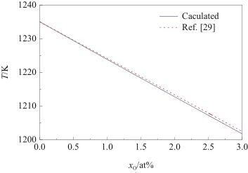為了驗證這種近似處理的合理性,使用理想溶體近似模型計算Ag-O系的液相線,并將結果與實驗相圖進行比較。