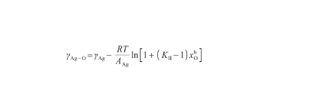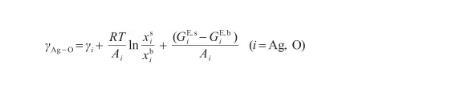 由式(12)和(13)可以看出,Butler方程計算較為復雜。考慮液態氧的表面張力很小[14],可以認為γO≈0。另外,由于Ag-O系中O原子數遠小于Ag原子數[29],可以將Ag-O溶體視為理想溶體。此時,GE,b=G=G=0。根據文獻[18],當式(12)所示的Butler方程用于描述理想溶液時,通過假設系統內兩組分具有相等的摩爾表面積,可以得到改進的Butler方程。這個改進的Bulter方程能夠推導出Gibbs吸附方程和Langmuir方程,被認為是表面張力和溶液吸附的根本方程。因此,令AAg=AO,將式(12)變換為: