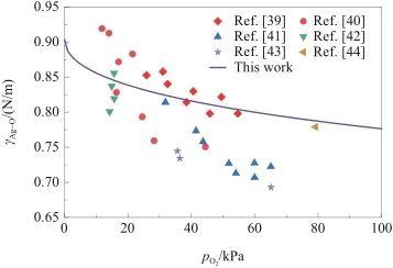 根據(jù)式(33),計(jì)算了1350 K下液態(tài)Ag-O系的表面張力γAg-O,并將計(jì)算結(jié)果與文獻(xiàn)數(shù)據(jù)[39-44]進(jìn)行比較,如圖5所示。觀察圖5可知,γAg-O與氧氣壓力呈負(fù)相關(guān)。在較低的氧氣壓力下,γAg-O的下降幅度比較顯著;而隨著氧氣壓力增加,γAg-O的下降幅度逐漸減小。另外,計(jì)算結(jié)果與文獻(xiàn)[39,40,44]吻合良好,但高于文獻(xiàn)[41-43]。這種差異是可以接受的,因?yàn)樗捎媚P蛢H考慮了溫度和氧氣壓力,而在實(shí)驗(yàn)過(guò)程中,系統(tǒng)的表面張力不可避免地受到雜質(zhì)的影響。
