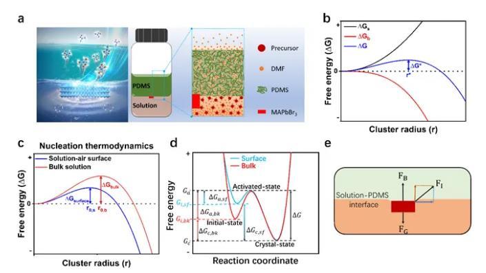 圖2.MAPbBr3鈣鈦礦結(jié)晶與晶體生長。(a)PDMS輔助結(jié)晶原理圖;(b)形核半徑與自由能的關(guān)系;(c)溶液的表面和內(nèi)部的形核半徑的比較;(d)生長過程中自由能變化圖解;(e)界面懸浮生長的力學(xué)圖解。