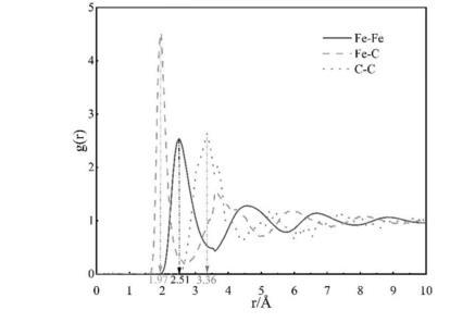 Fe-C二元體系經(jīng)計算得到的徑向分布函數(shù),F(xiàn)e-Fe、Fe-C、C-C原子對的平均鍵長分別為若原子間距離小于相應的鍵長值則表示兩個原子之間互相連接,根據(jù)碳原子連接的鐵原子個數(shù),可將鐵原子區(qū)分為自由態(tài)鐵原子(與碳原子沒有配位關系)、A型鐵(只與1個碳原子形成配位關系)、B型鐵(與2個或更多的碳原子形成配位關系)三種類別,根據(jù)模擬結(jié)果數(shù)據(jù)可對鐵原子的配位方式進行分析。