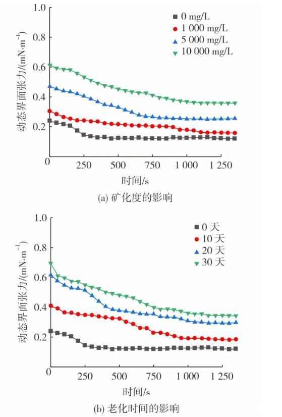 圖3為油藏條件對動態界面張力及界面擴張模量的影響。采用不同礦化度模擬水配制體系(0.06%(w)凍膠分散體+0.10%(w)降黏劑),在50℃老化10天。圖3(a)和圖3(c)呈現了礦化度對體系界面流變性質的影響。從圖3可知,隨著礦化度的提高,老化后體系的動態界面張力穩定值從0.127 mN/m增至0.356 mN/m。降黏劑帶有磺酸鹽基團,有較強的耐溫耐鹽能力,因此界面張力的提升幅度有限。此外,體系的界面擴張模量隨礦化度的增大而減低,這是由于地層水陽離子會對凍膠分散體之間的擴散雙電層產生壓縮作用,減小凍膠分散體表面負電量,降低其分散穩定性,體系黏度隨之下降。