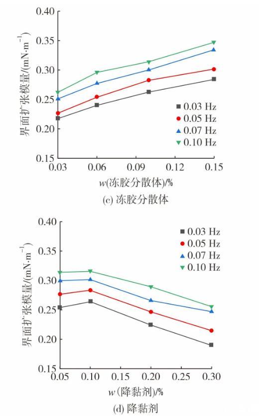 圖2為體系組成對動態界面張力及界面擴張模量的影響。圖2(a)和圖2(c)呈現了凍膠分散體質量分數對界面流變性質的影響。其中,降黏劑質量分數保持為0.10%。隨著振蕩時間的增加,體系界面張力逐漸趨于穩定。凍膠分散體在高質量分數時,穩定界面張力明顯更高,這是由于在降黏劑質量分數不變時,油水界面上降黏劑分子數量相對固定凍膠分散體在油水界面的吸附量隨質量分數增大逐漸增加,擠占了降黏劑分子在界面吸附位置。同時,由于體系黏度上升,降低了降黏劑向界面擴散的速度,導致界面張力增加。體系黏度提高,增加了動態擴張模量,在高質量分數凍膠分散體條件下,黏彈性提升效更加顯著。