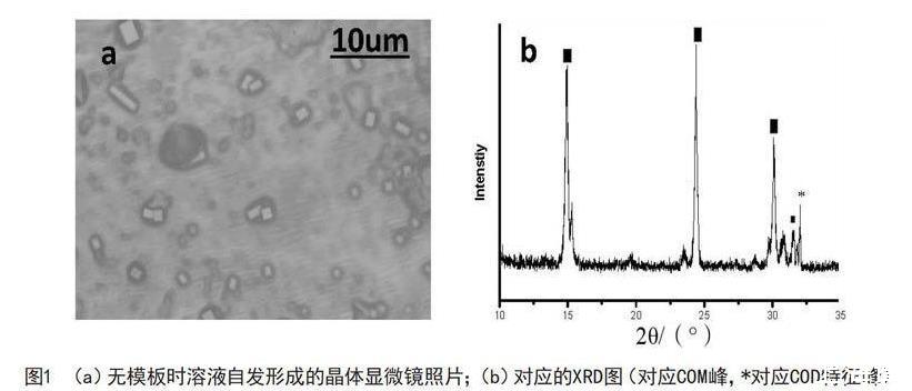 草酸鈣能夠形成3種水合物:一水草酸鈣草酸鈣(CaC204?H20,COM),二水草酸鈣(CaC204?2H20,COD),三水草酸鈣(CaC204?3H20,COT)。其中,一水草酸鈣是人類腎結石的主要成分。草酸鈣水合物是一種重要的仿生材料的研究體系。這3種草酸鈣晶體的熱力學穩定性分別是:COM>COD>COT。本研究采用十八胺LB膜為模板來誘導草酸鈣晶體生成,并探討LB誘導晶體成核與生長的機理。