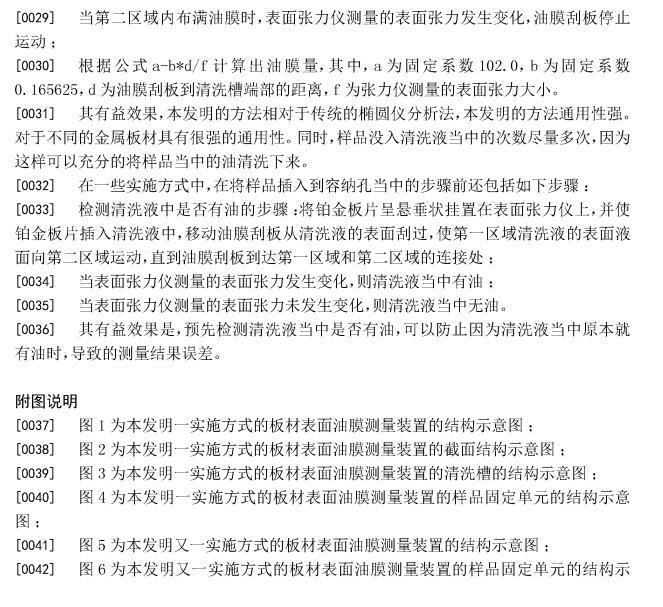 [0014]同時由于樣品固定單元是位于第一區(qū)域上方的,所以當油清洗下來的時候,首先是在第一區(qū)域的清洗液面擴散開來形成油膜。當油膜刮板從第一區(qū)域的一端向著第二區(qū)域方向運動的時候,油膜就會向第一區(qū)域運動,當?shù)谝粎^(qū)域內聚滿油膜的時候,表面張力儀就會通過鉑金板片感應到清洗液表面張力的變化,此時油油膜刮板停止運動,計算出整個油膜的面積。為了方便計算油膜的面積,可以在清洗槽的邊沿上設置相應的刻度,同時將油膜刮板設置成與清洗槽的邊沿相垂直。最后根據(jù)公式a-b*d/f計算出油膜量,其中,a為固定系數(shù)102.0,b為固定系數(shù)0.165625,d為油膜刮板到清洗槽端部的距離,f為張力儀測量的表面張力大小。