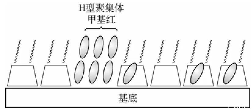 兩親性環(huán)糊精不僅能夠單獨組裝成LB膜,也能夠和其他有機分子共同組裝成雜化LB膜。Matsumoto課題組在兩親性環(huán)糊精和偶氮苯LB雜化膜方面做了大量的工作。因為偶氮苯化合物能夠在光照條件下發(fā)生可逆的順反光異構反應,若將偶氮苯在固體基底上進行組裝將對光儲存、光轉(zhuǎn)換器件的發(fā)展具有十分重要的意義。但是由于在單純LB膜中,偶氮苯分子周圍自由體積很小,限制了順反光異構反應的發(fā)生,而利用兩親性環(huán)糊精和偶氮苯雜化組裝成LB膜以解決這個問題。研究表明部分偶氮苯被包結在環(huán)糊精的空腔中,空腔為水溶性偶氮苯發(fā)生可逆的光異構化反應提供了良好的場所。此外,環(huán)糊精疏水鏈段也能夠成為容納客體分子的場所,而且在膜中并非所有的環(huán)糊精分子都會包結偶氮苯分子,剩余的未包結環(huán)糊精為進一步功能化提供了基礎。但是在該雜化膜中會有部分偶氮苯分子形成的聚集體(圖2),所以進一步增加雜化分子的包結率和分散性是這一類雜化膜的研究方向。