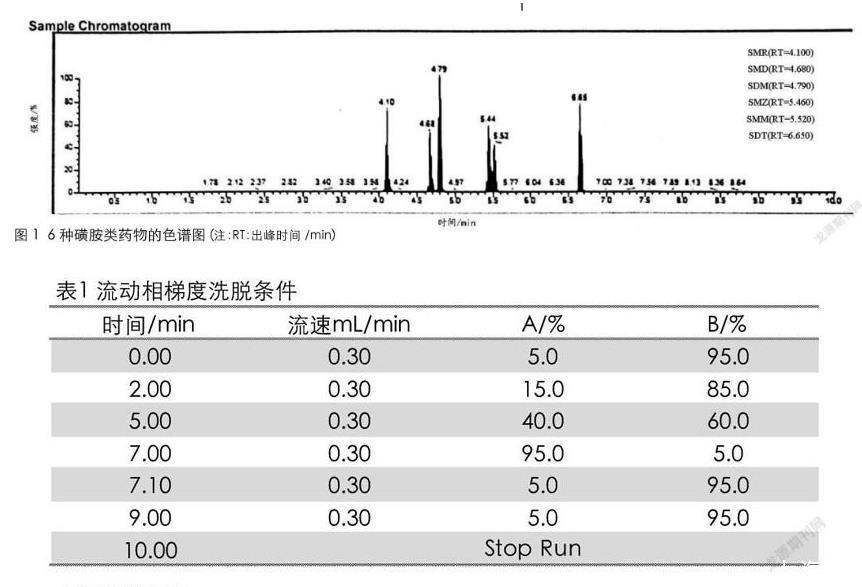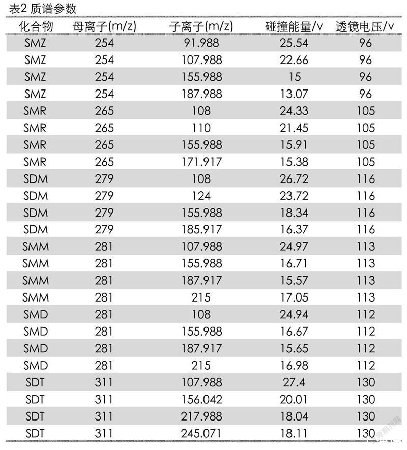 6種磺胺類標準物質:磺胺甲惡唑(SMZ)、磺胺甲基嘧啶(SMR)、磺胺間二甲氧嘧啶(SDM)、磺胺間甲氧嘧啶(SMM)、磺胺對甲氧嘧啶(SMD)、磺胺地索辛(SDT)(純度均大于99.5%,北京振翔科技有限公司);乙腈(色譜純,德國Merck公司);甲酸(色譜純,上海安普實驗科技有限公司)。