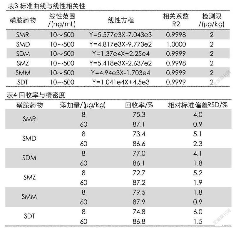 制備混合標準濃度系列,分別為10、50、100、250和500 ng/mL(分別相當于被測組分的含量為2、10、20、50和100μg/kg)。將標準工作液按照2.3.3的方法進樣測試。以進樣濃度為橫坐標,以峰面積的響應值為縱坐標繪制標準曲線,結果如表3所。6種磺胺類藥物在濃度10~500 ng/mL范圍內線性關系很好,相關系數R2≥0.9998。