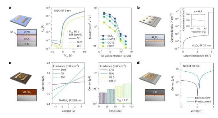 圖4展示了使用SF表面活性劑在憎水表面上制造水基納米器件的過程及其特性。研究發現,SF的自分離特性在不影響器件性能的情況下,保證了薄膜的質量和功能。在含有0.03 w/v%SF的IGZO晶體管中,遷移率保持在1至10 cm2/V·s之間,只有在SF濃度超過0.1 w/v%時才略有下降。即使在疏水性表面上,SF的存在也沒有顯著影響電荷遷移率或引起非理想狀態(圖4a)。在電介質材料中,SF摻雜的Al2O3薄膜顯示出良好的電氣性能(圖4b)。SF還被成功應用于制造基于MAPbI3和NiO的光電薄膜,這些薄膜在光照下產生光電流(圖4c,d)。相比商用表面活性劑,SF用量更少且對器件性能影響更小,并具有生物友好性,適用于生物活性傳感器和人機電子界面等領域,展示了在環保和經濟效益上的優勢。