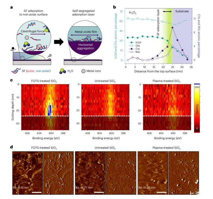 圖3a顯示了絲蛋白(SF)在不同表面能的基底上的吸附機制,假設疏水結構域與非極性表面相互作用,而親水結構域則面向溶液。作者通過X射線光電子能譜(XPS)和原子力顯微鏡(AFM)分析了摻有不同濃度SF的溶液在不同表面上的表現。XPS結果顯示,在非極性基底上,高濃度SF溶液形成了含有蛋白質的薄膜,并且在高能離子轟擊下薄膜和基底界面上仍保留有N1s信號(圖3b,c)。AFM分析則揭示了不同基底上的表面拓撲結構,非極性基底上呈現平躺形狀,而極性基底上則顯示島狀聚集體(圖3d)。研究表明,SF的吸附效率受表面能和分子量影響,并可有效增強潤濕性。這一適應性吸附機制有助于在不同表面上快速形成高質量金屬氧化物薄膜,無需調整沉積參數。