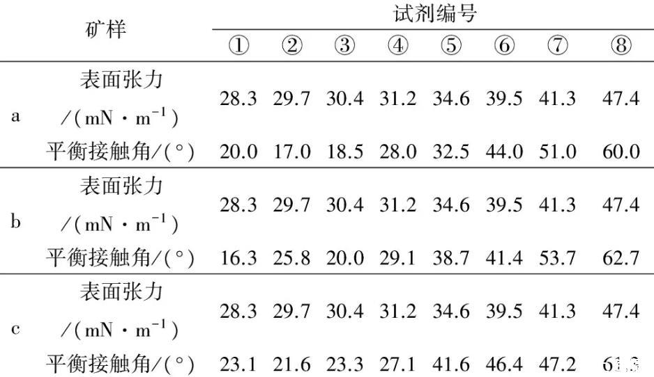 其中3種礦樣的表面張力和接觸角對應(yīng)值如表1所示。