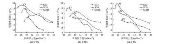 不一定是最大,3種礦塵吸濕速度出現(xiàn)峰值的位置也略有差別。但總體來說吸濕速度的峰值所對應(yīng)的表面張力SDBS位于26.8~27.3 mN/m,SDS所對應(yīng)的表面張力為28.2~29.1 mN/m,K12所對應(yīng)的表面張力為29.1 mN/m,綜合吸濕量和吸濕速度2個指標(biāo)可以得出最佳濕潤效果的表面張力值范圍,3種陰離子活性劑表面張力最佳范圍在26.8~30.2 mN/m。