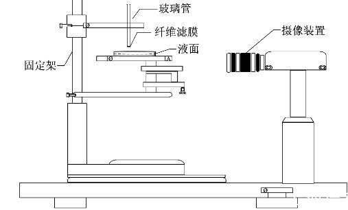 研究礦塵濕潤性能的裝置有很多,根據(jù)實(shí)際出發(fā),試驗(yàn)采用毛細(xì)管反向滲透法實(shí)驗(yàn)裝置。(1)本實(shí)驗(yàn)選用的玻璃管長度為200 mm,內(nèi)徑為4 mm,給每個玻璃管劃好刻度,其下端用纖維濾膜密封;(2)用分度值為0.1 mg的光學(xué)讀數(shù)分析天平稱取1.5 g的礦塵裝入干燥過后的玻璃管中,為提高精度,每次初填至60 mm,然后振實(shí);(3)將玻璃管固定在固定臺上,盛有濕潤劑溶液(約20 mL)的玻璃皿置于載物臺上,旋轉(zhuǎn)載物臺,使玻璃管底部與溶液表面接觸;(4)當(dāng)液面透過濾膜后,打開錄像設(shè)備記錄反向滲透到20,30,40 mm所需時間,同時記錄3 min后玻璃管的增重作為吸濕量。每種溶液對礦塵做3次試驗(yàn),取平均值。實(shí)驗(yàn)裝置如圖1所示。