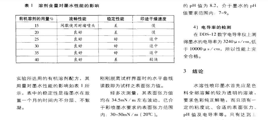 噴墨墨水中有機(jī)溶劑的成分及所占的比例對墨水的性能影響非常大。一般情況下,溶劑的用量是墨水重量的10%-50%。當(dāng)溶劑含量低于10%時(shí),作用不明顯,超過50%時(shí)有些染料則無法溶解。