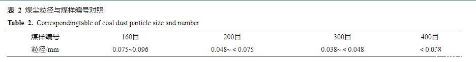 將EMI原液稀釋至質(zhì)量分?jǐn)?shù)分別為0.1%、0.2%、0.4%、0.6%、0.8%、1.0%、2.0%、4.0%、6.0%、8.0%的混合溶液。實(shí)驗(yàn)煤樣選取黃陵一號(hào)煤礦弱黏煤樣,煤樣工業(yè)分析結(jié)果見表1。在制備煤塵樣品時(shí),根據(jù)有關(guān)文獻(xiàn)對(duì)黃陵一號(hào)煤礦綜采工作面煤塵粒徑分布進(jìn)行檢測(cè),并結(jié)合國(guó)際標(biāo)準(zhǔn)化組織對(duì)粉塵粒徑的定義,以及實(shí)驗(yàn)室制備條件,去除煤塊外表皮,使用破碎機(jī)對(duì)煤心破碎60 s,用160、200、300、400目標(biāo)準(zhǔn)工業(yè)篩對(duì)煤粉進(jìn)行篩分,共篩分出0.075~0.096、0.048~<0.075、0.038~<0.048、<0.038 mm共4個(gè)粒度范圍的樣品進(jìn)行實(shí)驗(yàn),其中煤塵粒徑與煤樣編號(hào)見表2。煤樣制備完成后,將其放入80℃的真空干燥箱,真空干燥8 h后密封保存以備實(shí)驗(yàn)使用。