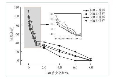 由圖5可知,針對160目測試煤樣,溶液中EMI質量分數大于2.0%后,接觸角的減小率更高,當溶液中EMI質量分數為6.0%時,接觸角為0°,煤樣被快速潤濕,達到完全潤濕狀態。EMI質量分數相同時,200目與300目測試煤樣的變化趨勢大致相同。200目測試煤樣在EMI質量分數小于1.0%的溶液時,接觸角呈線性減小趨勢,當大于1.0%后,接觸角減小率出現先逐漸變緩而后逐漸增大的細微波動;300目測試煤樣在EMI質量分數為0.1%~0.6%時,接觸角減小率出現細微波動,呈先變緩后逐步增大的趨勢;當溶液中EMI質量分數達到8.0%時,兩組測試煤樣均達到完全潤濕狀態,接觸角為0°。而400目測試煤樣的煤塵粒徑最小,煤樣的潤濕性較弱,當溶液中EMI質量分數為0.8%~2.0%時,接觸角減小率呈先逐漸增大而后逐漸變緩的趨勢;當溶液中EMI質量分數大于2.0%時,接觸角的減小率呈線性降低趨勢;當溶液中EMI質量分數達到8.0%時,煤樣還未達到完全潤濕狀態。
