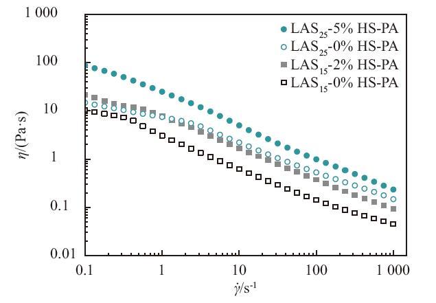 4種不同的配方體系中,只有未經烘箱存放的LAS體系全部通過了常溫離心測試,因此,僅測試該體系樣品(表2)的流變性能。將黏度與剪切速率繪制成η-γ圖。樣品的流變行為特征符合Herschel-Bulkley模型,模型方程為: