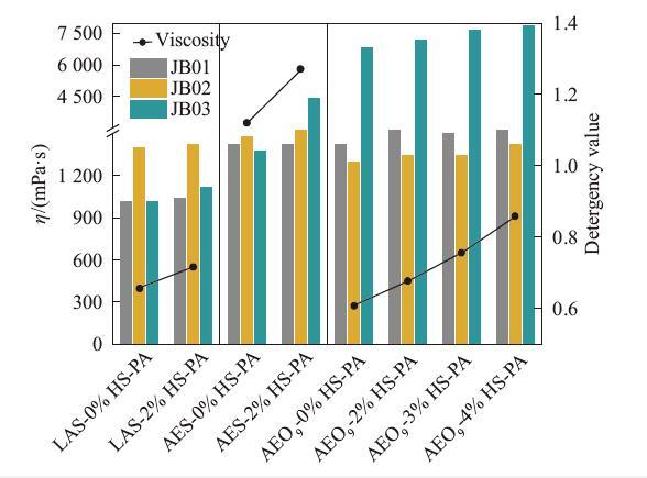 圖4 HS-PA在不同主表面活性劑洗滌劑中的增稠和去污作用