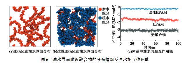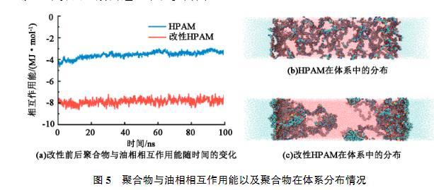 界面張力來自于界面處分子受到的應(yīng)力不均衡,因此需要增加兩相之間的聯(lián)系,從而減少界面張力。由于HPAM分子本身親水,與水相具有較強(qiáng)的相互作用,因此主要考察HPAM和油相之間的相互作用強(qiáng)度。圖5(a)為HPAM和改性HPAM與油相的相互作用能隨時間的變化。可以看出,HPAM在0~100 ns的模擬過程中相互作用強(qiáng)度逐漸降低,說明部分HPAM從油水界面處脫離進(jìn)入水相。由圖5(b)也看出HPAM分子大量均勻分布在水相中,其主要原因也是缺少親油基團(tuán),不易在界面處穩(wěn)定存在,更傾向于溶解于水中。而引入疏水基團(tuán)改性后的HPAM與油相的相互作用能明顯強(qiáng)于HPAM與油相的作用能。由圖5(c)看出改性HPAM大多數(shù)分布在油水界面附近。改性HPAM在界面處橋接了油相與水相,緩解了界面處分子應(yīng)力不均衡,從而起到降低界面張力的效果。