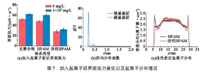 部分儲層中存在較高的礦化度,為此進(jìn)一步研究鹽離子對界面張力的影響。在3個體系的水相中分別加入質(zhì)量濃度為100 g/L的NaCl,觀察其對界面張力的影響情況,結(jié)果見圖7(a)。可以看出,對于沒有聚合物存在的體系中,界面張力會隨著鹽離子的增加而增大。這是由于鹽離子的存在增大了水相的極性,從而拉大了油水兩相性質(zhì)上的差距,增大了油水界面張力。因此當(dāng)界面處的鹽離子增多時,界面張力則會增大。加入HPAM的體系中也出現(xiàn)了類似的情況。然而引入磺酸基團(tuán)改性后的HPAM則受鹽離子的影響較小。為了解釋這一現(xiàn)象的物理機(jī)制,分析了帶電基團(tuán)周圍Na+分布(圖7(b))。通過計(jì)算徑向分布函數(shù)g(r),發(fā)現(xiàn)羧酸基團(tuán)周圍吸引了較多的Na+,導(dǎo)致Na+在聚合物附近聚集,而改性引入的磺酸基團(tuán)具有一定的抗鹽作用,其周圍分布的Na+數(shù)量更少。這也就導(dǎo)致2種體系界面附近Na+密度不同(圖7(c))。由于HPAM含有較多的羧酸基團(tuán),會引起Na+在聚合物附近的富集,導(dǎo)致界面張力的增加。而在加入改性HPAM后,引入的磺酸基團(tuán)對Na+的吸引力較弱,導(dǎo)致界面附近的Na+和改性前相比有明顯的減少,界面張力增加較少。因此加入磺化改性的HPAM在高礦化度下仍然可以保持較高的界面活性。