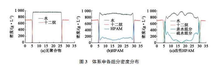 聚合物改變油水界面張力的本質(zhì)是油水界面特征的改變,為此分析各個組分在體系中的密度分布情況,結(jié)果見圖3。可以看出,在沒有聚合物的情況下,油水界面非常清晰,油相和水相處于完全分離的狀態(tài)。加入HPAM后,油相的分布幾乎沒有變化,而界面處水相密度變化的斜率略有減少,說明HPAM主要分布在水相中,在一定程度上減少了界面上水分子的數(shù)量。但由于HPAM和油相之間的相互作用較弱,因此并沒有改變油相在界面附近的分布情況。改性HPAM的加入對油水兩相的密度分布影響都較大,界面處油相密度變化的斜率減小,說明親油組分和油分子相互融合,從密度分布還可以看出由于聚合物的加入,油相和水相被聚合物顯著分離。