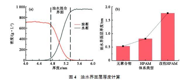 界面層厚度能夠反映油水界面處兩相的混合情況,一般來說界面厚度越大說明兩相之間的排斥越小,互溶效果越好,界面張力越低。參考Ricardo Paredes等的方法,選取密度低于油和水密度峰值90%的區(qū)域作為油水混合界面,如圖4(a)所示。計(jì)算得到的界面層厚度見圖4(b)。可以發(fā)現(xiàn),加入HPAM對于界面層影響很小,改性HPAM的加入可以大幅提高油水界面層厚度。這也反映出未改性HPAM油水界面依然比較清晰,兩相界限明顯,界面處油分子和水分子受力不均勻的現(xiàn)象依然嚴(yán)重;改性HPAM疏水基團(tuán)進(jìn)入油相中,引起z方向油水分布重疊區(qū)域變大,油水界面區(qū)域擴(kuò)展,油水界面變得凹凸不平,油水相的“螯合”加強(qiáng),界面處分子受力不均衡得到了緩解,有利于界面張力降低。