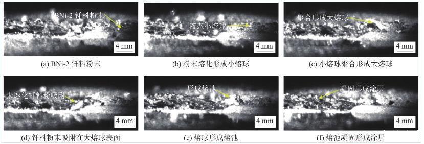 圖3是激光釬涂過(guò)程中的超高速攝影照片(4000幅/s),直觀地表征了激光釬涂過(guò)程中釬料粉末在激光作用下熔化、鋪展、凝固的過(guò)程。從圖3中可看出,在激光釬涂過(guò)程中,釬料呈現(xiàn)4種狀態(tài),分別為粉末態(tài)、熔球態(tài)、熔池態(tài)、凝固態(tài)。在激光未掃描的位置,釬料保持原始的粉末狀態(tài),如圖3a所示。被激光束掃到的位置,粉末態(tài)的釬料吸收能量,升溫熔化,形成尺寸較小的液態(tài)熔球,如圖3b所示。隨后,粉末釬料的不斷熔化形成更多液態(tài)小熔球,尺寸較小的熔球互相結(jié)合匯聚成尺寸較大的液態(tài)熔球,如圖3c所示。同時(shí)可觀察到未熔化的釬料粉末在液/固界面張力作用下,逐漸被吸附到尺寸較大的熔球表面,如圖3d所示。隨著激光逐漸向前掃描,熔球不斷長(zhǎng)大,當(dāng)熔球固相表面張力與重力的合力作用大于液/固界面張力后,大尺寸熔球在基體鋪展?jié)櫇瘢纬扇鄢兀鐖D3e所示。最后,隨著激光熱源的移動(dòng),激光后端的熔池溫度逐漸降低,液態(tài)釬料逐漸凝固,在基體表面形成涂層,如圖3f所示。