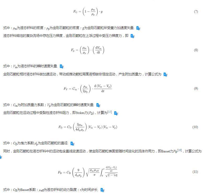 對(duì)于液態(tài)釬料熔池中存在復(fù)雜流場(chǎng),金剛石顆粒上浮過(guò)程中存在重力和浮力的共同作用,計(jì)算公式為