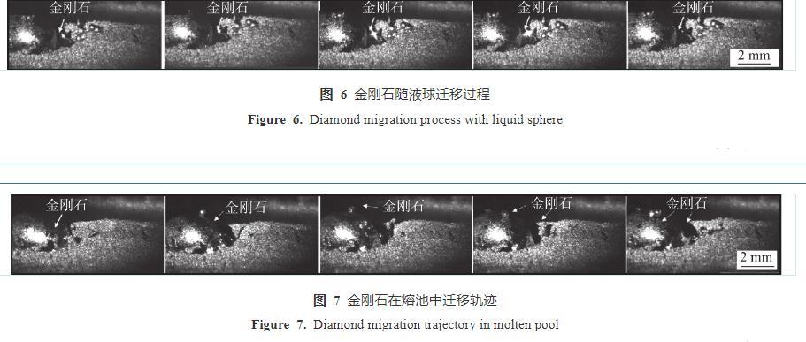 圖8為金剛石置于釬料底部時(shí),金剛石在激光釬涂過(guò)程中運(yùn)動(dòng)軌跡。可見(jiàn),無(wú)論金剛石是直接鋪置于釬料表面,還是置于釬料底部,在釬涂過(guò)程中,金剛石均會(huì)上浮到涂層表層。具體過(guò)程為在激光熱源作用下,表層的釬料開(kāi)始熔化成液態(tài)小球,由于金剛石的高透光性和高熔點(diǎn),金剛石不會(huì)熔化。在液態(tài)小球聚集長(zhǎng)大的過(guò)程中,金剛石沿著液球邊緣運(yùn)動(dòng),當(dāng)液態(tài)小球匯入大熔球時(shí),金剛石繼續(xù)沿著大熔球的邊緣向表面運(yùn)動(dòng),最后凝固于釬料涂層表層。