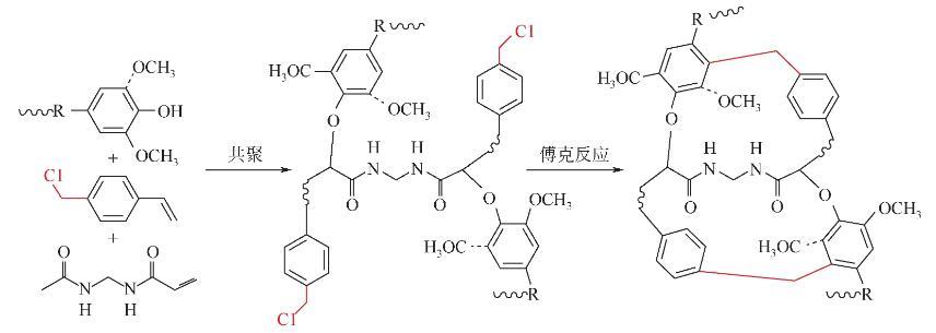 以上文獻(xiàn)表明木質(zhì)素基多孔聚合物作為吸附劑擁有巨大潛力,但目前報(bào)道的木質(zhì)素基聚合物的比表面積仍相對較小,且多為介孔大孔結(jié)構(gòu),雜原子含量不高,吸附性能仍有待提高。此外,將其應(yīng)用于放射性碘捕獲也很少有文獻(xiàn)報(bào)道?;诖?,本文擬采用多步化學(xué)交聯(lián)策略,即先通過自由基共聚反應(yīng)接枝一定量的可烷基化或酰基化基團(tuán)的芳香族單體,且聚合中加入少量含雜原子的雙烯單體,使其得到理想的親疏水性以及充足的碘親和位點(diǎn)。接著,通過Friedel-Crafts反應(yīng)使上述內(nèi)親電試劑在木質(zhì)素共聚物的大分子鏈之間搭建大量由亞甲基等剛性基團(tuán)形成的交聯(lián)橋,原位構(gòu)筑剛性結(jié)構(gòu)支撐的雜原子修飾木質(zhì)素基超交聯(lián)聚合物,從而保證其對碘蒸氣或碘溶液具有快速的吸附速率、良好的穩(wěn)定性和高的吸附容量。