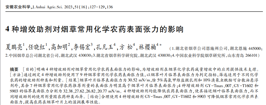 [結(jié)論]合理使用4種增效助劑GY-Tmax、007、GY-T1602和S903可降低煙草常用化學(xué)農(nóng)藥表面張力,提高農(nóng)藥在煙草葉片上的濕潤展布性能。