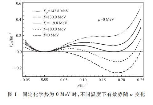 為了更加準確地描述夸克-膠子等離子體(Quark-Gluon plasma,QGP)與強子物質之間的相變特征,在溫度密度有限的情況下,通過嚴格的數值方法,固定化學勢為μ=0 MeV,作出如下有效勢Veff隨σ場變化的函數關系圖像。其中,由上至下曲線的溫度依次設定為T=142.8,130.0,119.8,100.0以及0 MeV.如圖所示,在溫度相對較低時,每條勢能曲線都具有兩個極小值和一個極大值,一個極小值位于σ較小的σ0處,另一個極小值位于σ較大的σv處,其間存在一個局域極大值,對應兩極小值之間存在的勢壘。