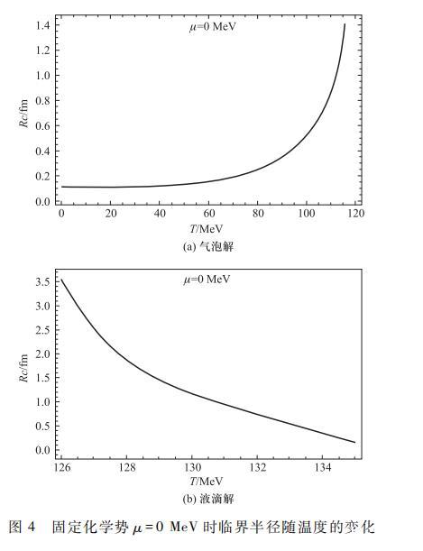 反過來,圖2(b)所示的液滴解中同樣可做類似討論。液滴解曲線的拐點處也可以粗略看做液滴的臨界半徑,隨著溫度的逐漸降低而靠近相變臨界溫度,液滴解的半徑逐漸增加,同樣在接近臨界溫度處液滴解隨溫度的變化明顯大于遠離臨界溫度處時的變化。這就是說,在強子背景中產生了許多大小不一的夸克液滴,當溫度靠近臨界溫度時,由于此時對應液滴的臨界半徑較大,因此許多隨機產生的液滴難以達到臨界液滴的半徑就在產生后在表面張力作用下收縮消失了;但當溫度逐漸升高,液滴的臨界半徑減小,將會存在越來越多隨機產生的半徑大于臨界半徑的液滴,這些液滴發生膨脹并彼此間相互合并最終充滿整個空間完成相變過程。