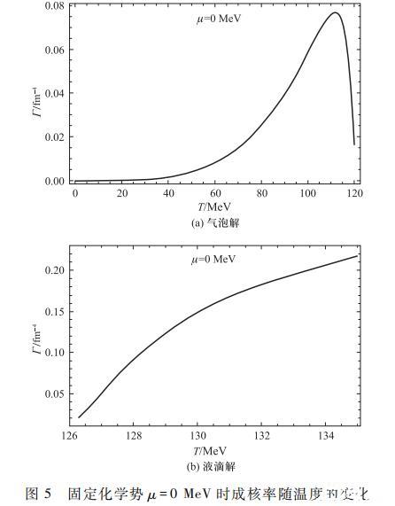 特別需要說明的是在臨界溫度附近,當式(17)中的指數部分ΔFb/T≌1時對應的溫度在一級相變的過程中具有重要意義,其標示了亞穩相真正向穩定相發生實際轉變的開始。以氣泡解為例,當ΔFb/T≌1時,Γ的指數項變為1/e,此時對應的溫度為T1=118.1 MeV,這說明在Tc=119.8 MeV和T1=118.1 MeV之間系統能夠在相對長的時間內保持在夸克相亞穩態。但當溫度進一步降低時,夸克相亞穩態才會實際上通過氣泡動力學過程快速地向穩定強子相轉變,即液相背景中快速產生強子氣泡并迅速膨脹合并從而完成相變過程。液滴解中的物理過程完全類似,液滴解在T2=127.3 MeV時有ΔFb/T≌1,表明在Tc=119.8 MeV和T2=127.3 MeV之間系統能夠在相對長的時間內保持在強子相亞穩態,只有當溫度進一步升高到超過T2=127.3 MeV時,系統將通過液滴成核的動力學過程快速向夸克相轉變。當溫度升高至Tsp=142.8 MeV時,強子的亞穩態真空完全消失,如果此時相變還沒有全部完成,那么系統會發生劇烈的強子相到夸克相的轉變過程。