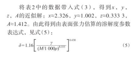 將表2中的數據帶入式(3),得到x,y,z,A的近似解:x≈2.326,y≈1.002,z≈0.333 3,A≈1.412。由此得到由表面張力估算的溶解度參數表達式,見式(5):