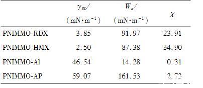 表3PNIMMO與推進劑組分的界面張力、界面黏附功及二者比值χ