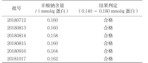 取每1 g蛋白質(zhì)中含0.130 mmol、0.160 mmol、0.190 mmol辛酸鈉的加標(biāo)回收率溶液作為供試品,每個(gè)濃度分別制備3份進(jìn)行測定,根據(jù)標(biāo)準(zhǔn)曲線計(jì)算辛酸鈉含量。