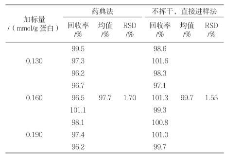 由表3可知,藥典方法測得的9次回收率的平均值為97.7%,RSD值為1.70%;不揮干,直接進(jìn)樣法測得的9次回收率的平均值為99.7%,RSD值為1.55%。對兩組數(shù)據(jù)進(jìn)行單因素方法分析,F(xiàn)=7.530,P=0.02<0.05,兩組數(shù)據(jù)有顯著性差異。方法優(yōu)化后準(zhǔn)確度更接近100%,這是因?yàn)閮?yōu)化后的方法不受揮干速度的影響[3],進(jìn)樣溶液比藥典方法均勻,損失量相對較小。