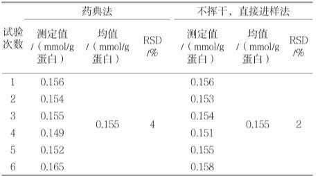 由表2可知,方法優(yōu)化前、后的重復(fù)性試驗(yàn)RSD值分別為4%、2%。對兩組數(shù)據(jù)進(jìn)行方差齊性檢驗(yàn),F(xiàn)=1.108,P=0.317>0.05,方差具有齊性,即兩組數(shù)據(jù)精密度無顯著性差異,表明進(jìn)樣濃度降低并不影響實(shí)驗(yàn)結(jié)果的精密度。