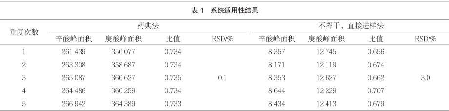 由表1可知,不揮干,直接進(jìn)樣法(優(yōu)化后的方法)所得峰面積較小,這是因?yàn)閮?yōu)化后方法的辛酸對照品溶液不揮發(fā)至干,直接進(jìn)樣使得濃度變低,峰面積變小,但不影響積分。連續(xù)5針辛酸峰與庚酸峰面積之比的RSD值由藥典方法的0.1%變?yōu)?.0%,但仍符合系統(tǒng)適用性要求(不大于5%)。實(shí)驗(yàn)時(shí)間由2 d縮短為1 d。