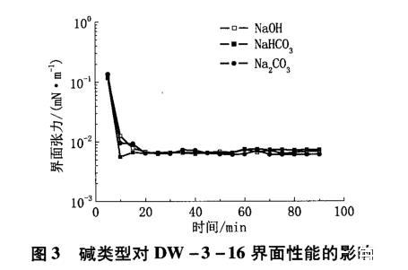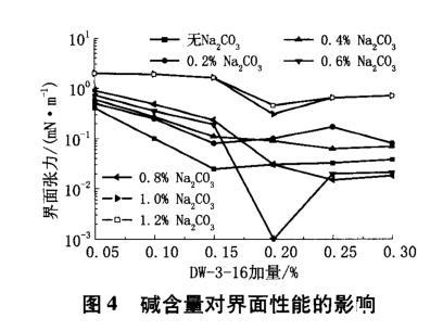 三元復合驅(qū)中注入堿能引起地層黏土分散、運移,導致地層滲透率下降,堿與油層流體及巖石礦物反應,可形成堿垢,對地層造成傷害,會引起油井結(jié)垢,影響油井正常生產(chǎn);加入堿能大幅降低聚合物的黏彈性。因此,堿對DW-3-16表面活性劑性能的影響至關(guān)重要。