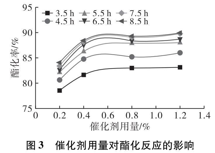 在投料比1∶1,預(yù)熱溫度80℃,預(yù)熱時(shí)間5 min,催化劑選擇4?型分子篩,反應(yīng)溫度140℃,反應(yīng)時(shí)間8.5 h,催化劑用量分別為0.2%、0.4%、0.8%、1.2%條件下進(jìn)行酯化反應(yīng)。反應(yīng)3.5 h后每隔1 h取樣測試產(chǎn)物酸價(jià),計(jì)算酯化率隨時(shí)間的變化,結(jié)果如圖3所示。