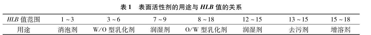 HLB值可用來衡量表面活性劑的親水親油性的大小,HLB值越大代表親水性越強(qiáng),HLB值越小代表親油性越強(qiáng),HLB值的轉(zhuǎn)折點(diǎn)為10,HLB值大于10一般為親水性,HLB值小于10為親油性,人們一般以HLB值為標(biāo)準(zhǔn)指導(dǎo)表面活性劑的實(shí)際應(yīng)用(見表1)。