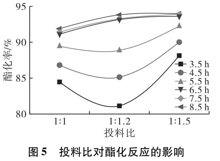 在投料比分別取1∶1、1∶1.2、1∶1.5,預(yù)熱溫度80℃,預(yù)熱時(shí)間5 min,0.4%的4?型分子篩催化劑,反應(yīng)溫度180℃,反應(yīng)時(shí)間8.5 h條件下進(jìn)行酯化反應(yīng)。反應(yīng)3.5 h后每隔1 h取樣測試產(chǎn)物酸價(jià),計(jì)算酯化率隨時(shí)間的變化,結(jié)果如圖5所示。