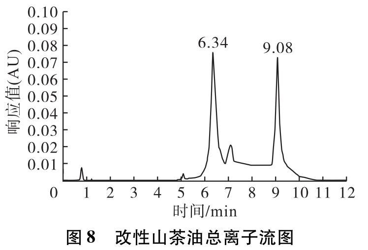 因?yàn)锳ccucoreTMC18色譜柱為非極性毛細(xì)管柱,非極性柱的保留作用主要是色散力造成的,其出峰順序一般符合沸點(diǎn)規(guī)律,沸點(diǎn)低的先出峰,沸點(diǎn)高的后出峰,所以PEG600單酯先出峰,PEG600雙酯后出峰。通過譜庫檢索發(fā)現(xiàn),6.34 min的峰主要是PEG600單酯,而9.08 min的峰主要是PEG600雙酯,這也說明PEG600和山茶油的水解產(chǎn)物發(fā)生了酯化反應(yīng)且改性山茶油的主要成分是PEG600單、雙酯。