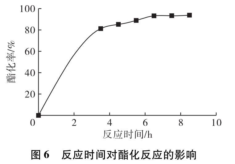 由圖6可知,隨著反應(yīng)時(shí)間的延長,反應(yīng)速率逐漸減慢,酯化率不斷增加,當(dāng)反應(yīng)時(shí)間為6.5 h之后反應(yīng)逐漸趨于平衡,繼續(xù)延長反應(yīng)時(shí)間對酯化率并沒有很大的影響。繼續(xù)延長反應(yīng)時(shí)間不僅會增加產(chǎn)物被氧化的風(fēng)險(xiǎn),而且還會造成資源浪費(fèi)。綜合考慮,選擇反應(yīng)時(shí)間為6.5 h。