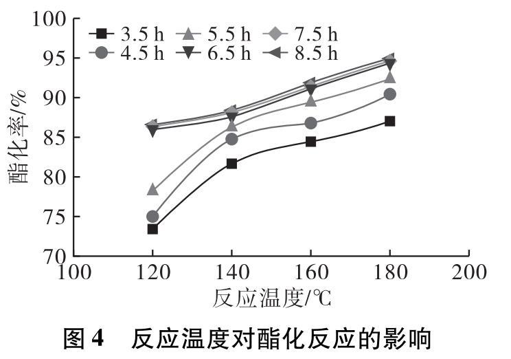 在投料比1∶1,預(yù)熱溫度80℃,預(yù)熱時(shí)間5 min,0.4%的4?型分子篩催化劑,分別設(shè)定反應(yīng)溫度為120、140、160、180℃,反應(yīng)時(shí)間8.5 h條件下進(jìn)行酯化反應(yīng)。反應(yīng)3.5 h后每隔1 h取樣測試產(chǎn)物酸價(jià),計(jì)算酯化率隨時(shí)間的變化,結(jié)果如圖4所示。