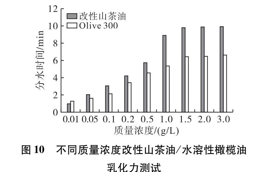 采用分水法對不同質(zhì)量濃度的改性山茶油和水溶性橄欖油(Olive 300)進(jìn)行乳化力測試,分水時(shí)間越長表明乳化性能越好,其結(jié)果如圖10所示。