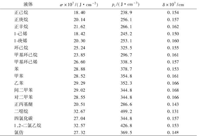 表1是用此法算得的結果。表中列出了293.15K時若干非極性或弱極性液體的表面張力和內壓力實驗值,由式(8)算得的液體表面層厚度δ則列在表1的最后一列。