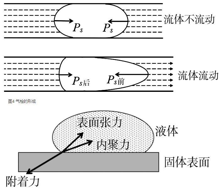 液體流動時會受到液體中氣泡的阻礙作用。若流管較細且液體中氣泡較多時可能會因為氣體阻礙作用嚴重而造成流管堵塞,這種現(xiàn)象稱氣體栓塞,簡稱氣栓。